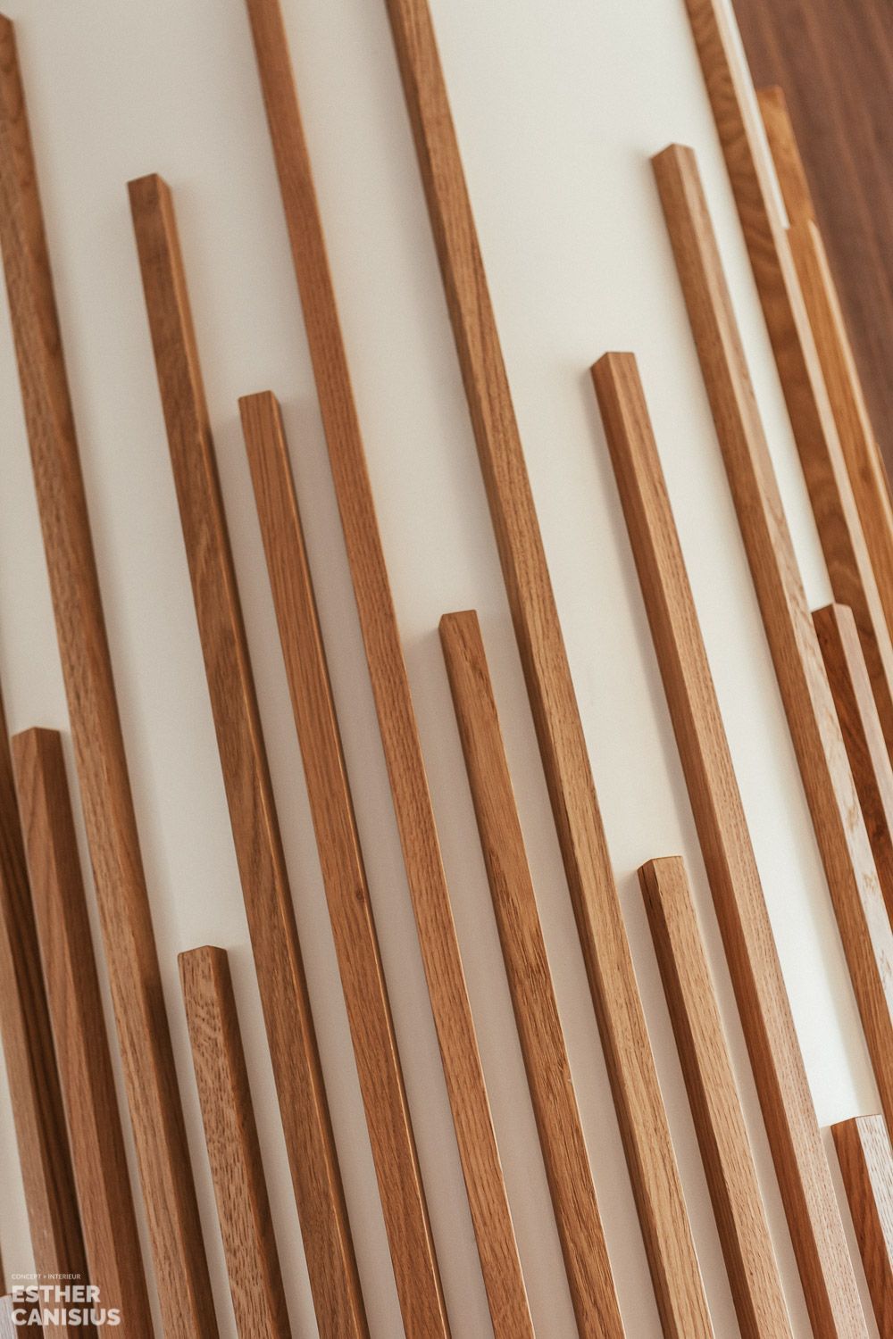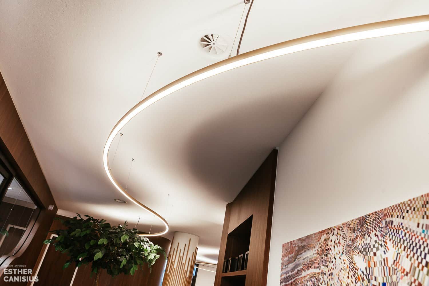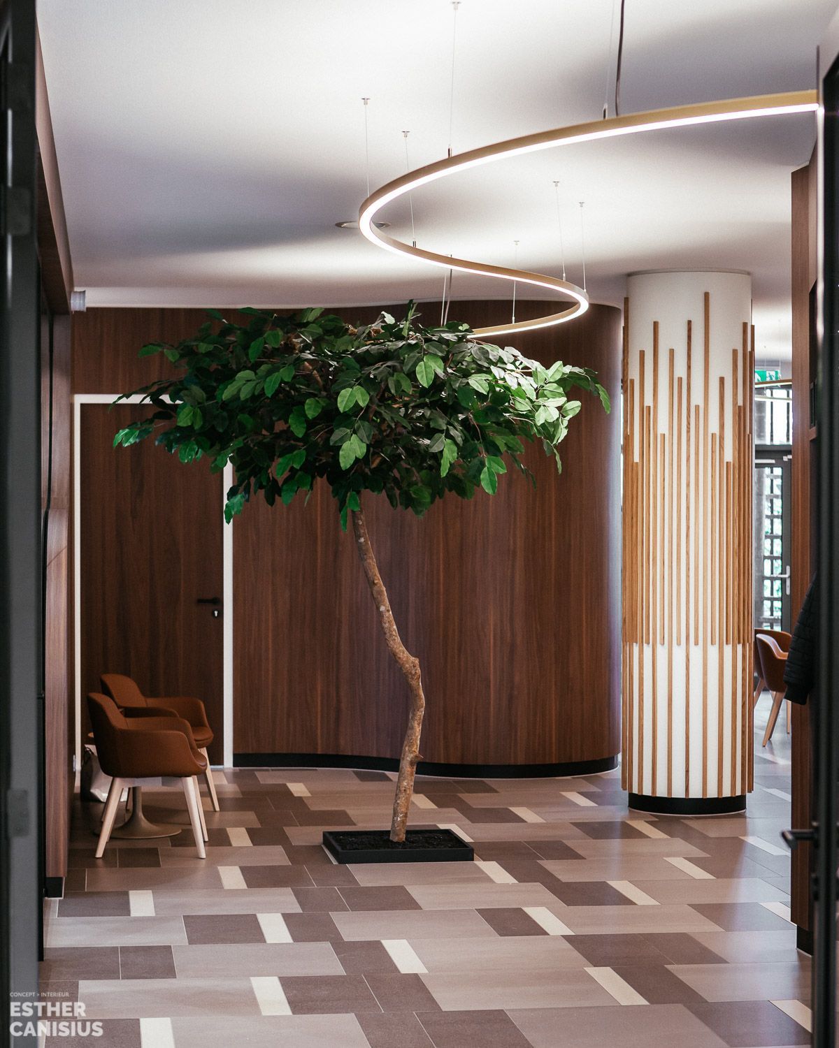 Ik vertaalde dit naar een interieurontwerp met ronde en organische vormen die vloeiend in elkaar overlopen. De up/down verlichtingsarmaturen zijn voor deze gelegenheid ontworpen en op maat gemaakt, Ze zuigen je als het ware naar binnen en wijzen je de weg door het pand. De open en transparante ruimtes worden omgeven door grote ramen en ronde houten wanden die zorgen voor een geborgen gevoel. Het akoestisch stucplafond en de gordijnen, die het buitenlicht mooi filteren, geven een serene sfeer waar je comfortabel kunt verblijven. De meubels zijn zacht en comfortabel en overal is ruimte genoeg om (ook met rollator) goed te manoeuvreren.