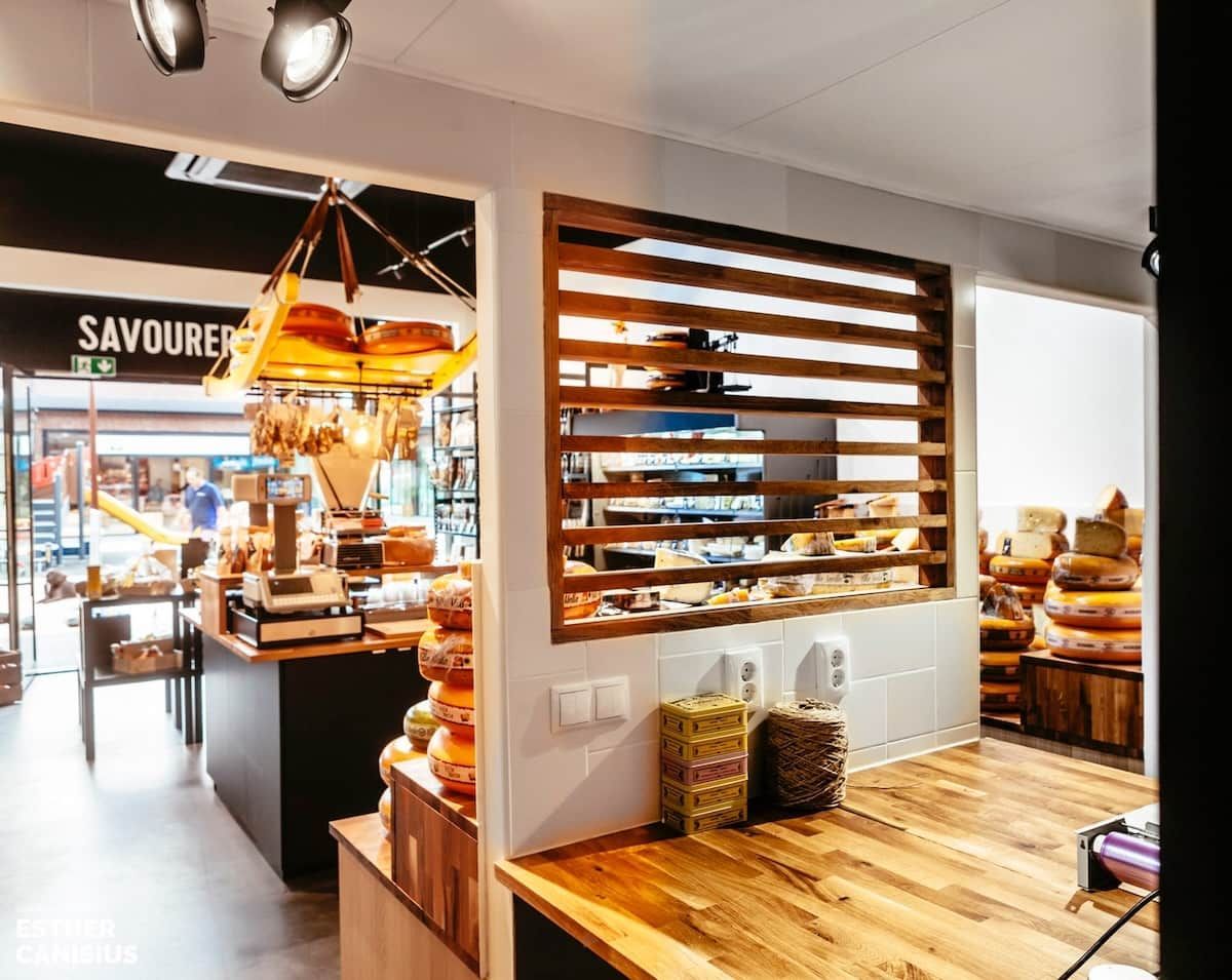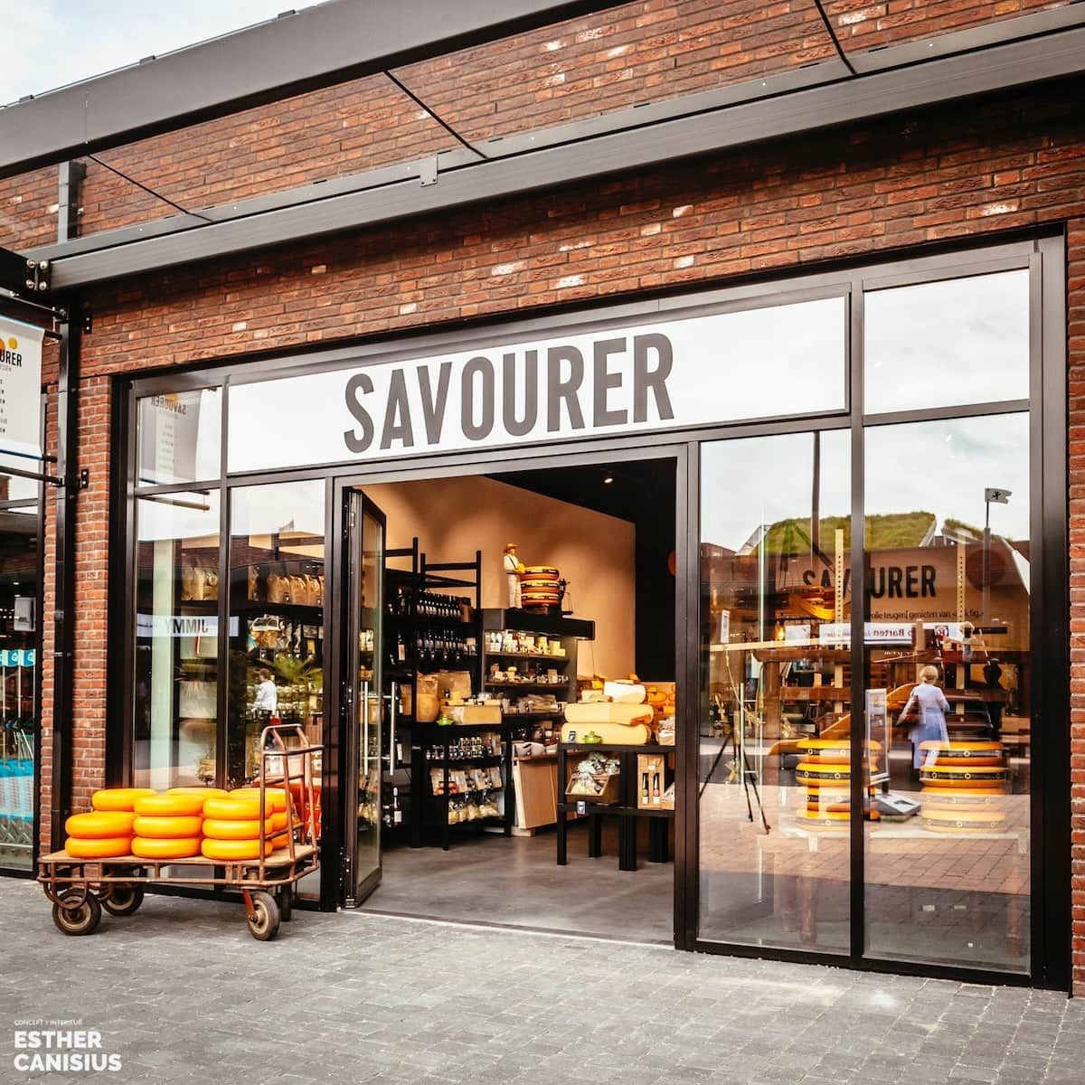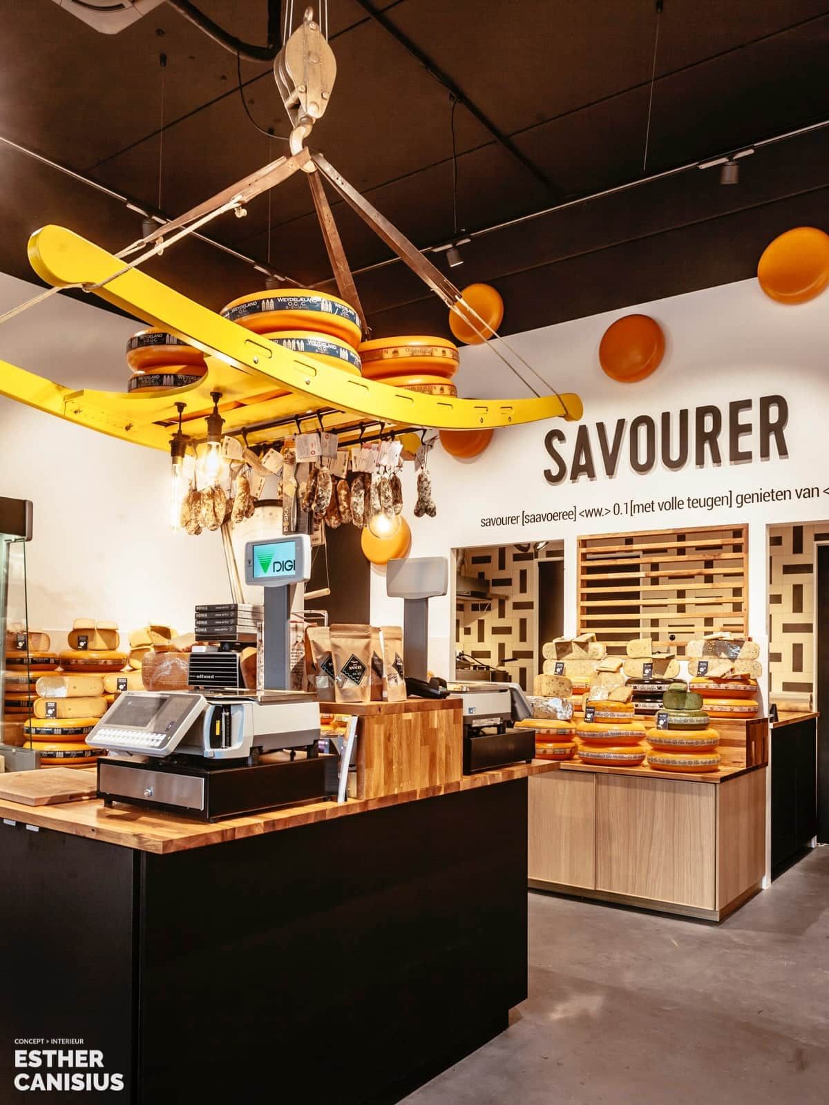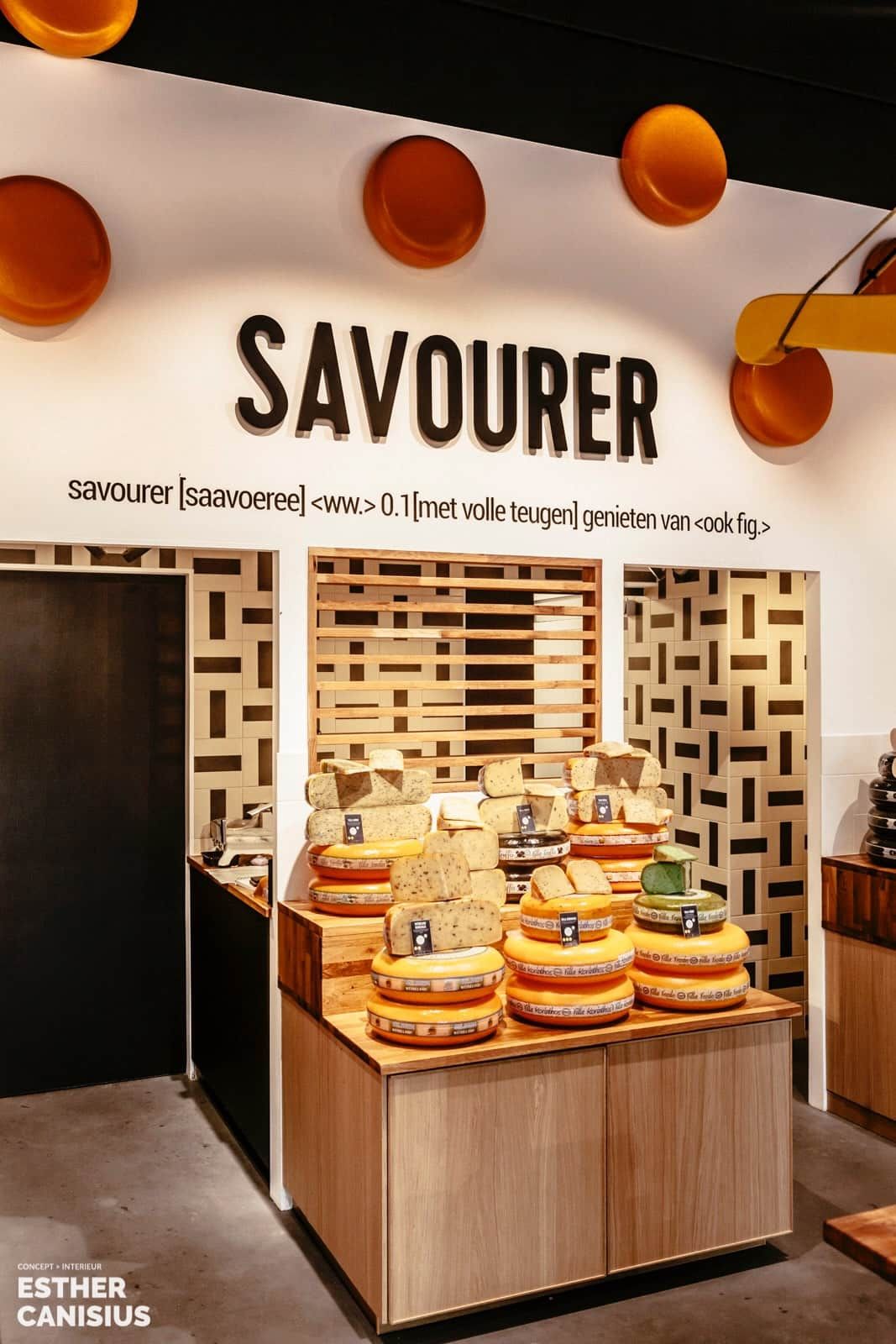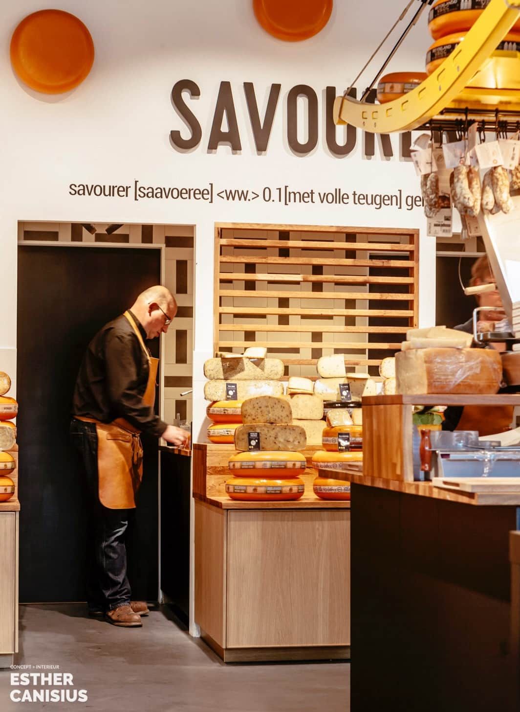 Savourer is de Franse benaming voor “met volle teugen genieten” en dat is wat Monica en Johan voor iedereen wensen. En voor de winkel wilden ze iets bijzonders. Natuurlijk moest het praktisch worden, maar zeker ook mooi! En zomaar kaasdummy’s stapelen was een no-go. “Dat doet iedereen al, dus dat willen w ij niet”, was de motivatie. “En een beetje gekkigheid past goed bij ons. Dat willen we graag terugzien zien in onze winkel.”