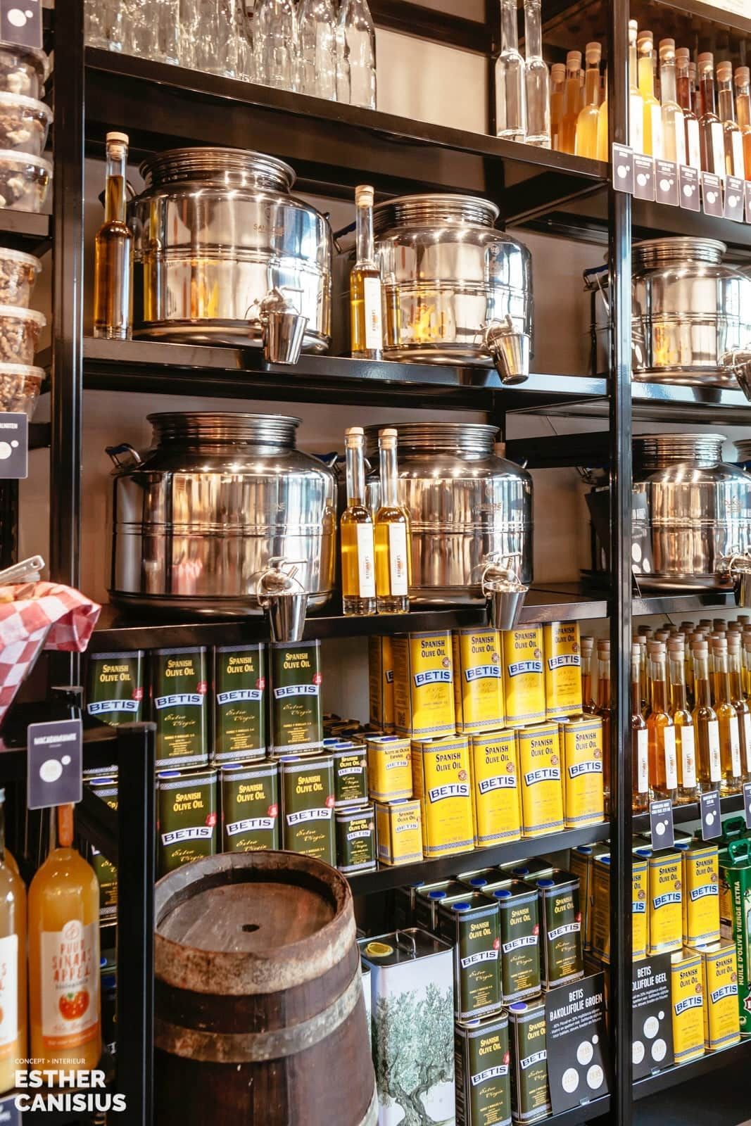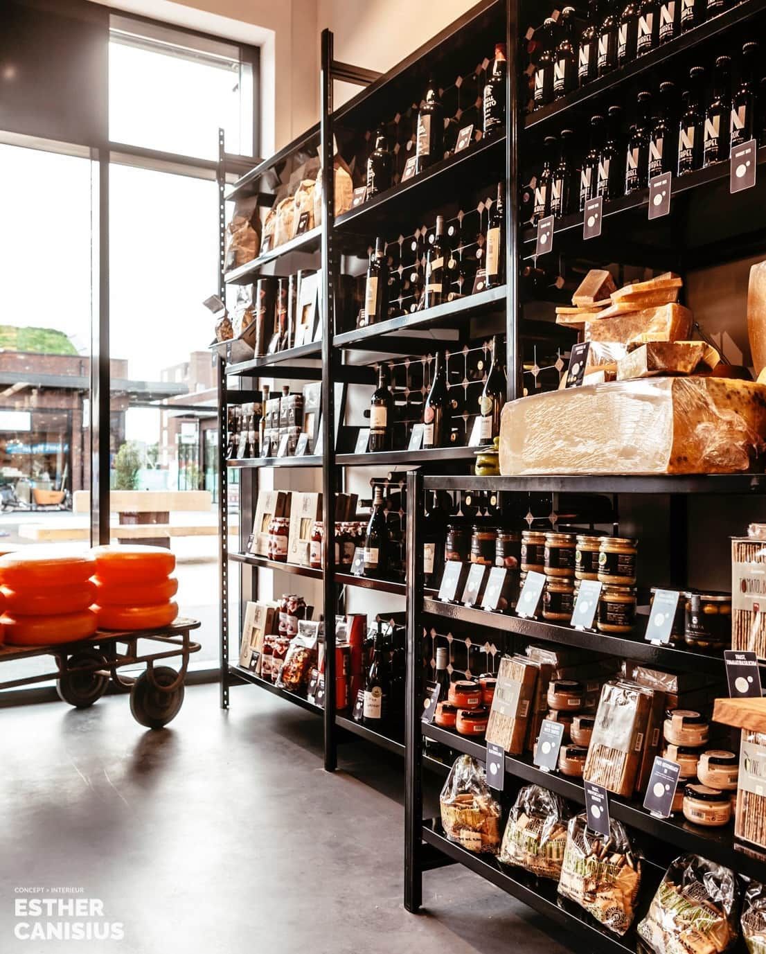 Het ontwerp is open en toegankelijk en als je de winkel binnenkomt heb je direct overzicht. Als klant word je ontvangen, geadviseerd en begeleid bij je aankopen. Vanaf het werkblad achterin is tussen de houten lamellen door goed zicht op de winkel en vanuit de winkel is deze ruimte gedeeltelijk aan het zicht onttrokken. Even een cadeautje inpakken, kaas raspen of noten branden kan gewoon tussen het werk door gedaan worden zonder dat het de werkzaamheden in de winkel verstoort. De dubbele schuifdeuren achterin zorgen dat er meerdere mogelijkheden zijn om vanuit de keuken met koelcel de winkel te bereiken en vice versa, zonder dat dit ten kosten gaat van de ruimte.