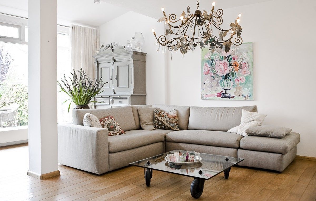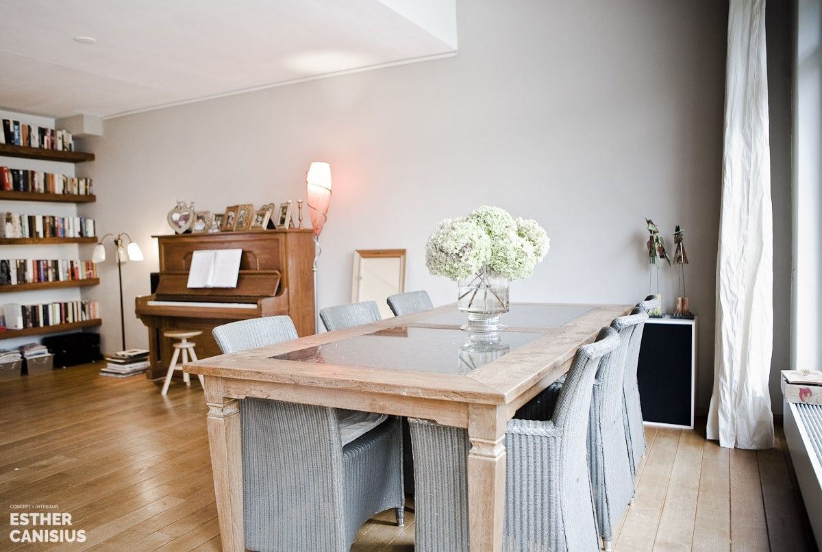 Naar wens van de bewoners een interieurontwerp; strakke vormen, warme materialen, lichte kleurstelling. Fijne zitplek voor 4 personen met televisie en een eethoek voor 6 personen met zicht op de tuin. Ondanks de kolom in het midden van de woonkamer zoeken naar een eenheid in het interieur. Ruimte voor een boekenkast en een piano.